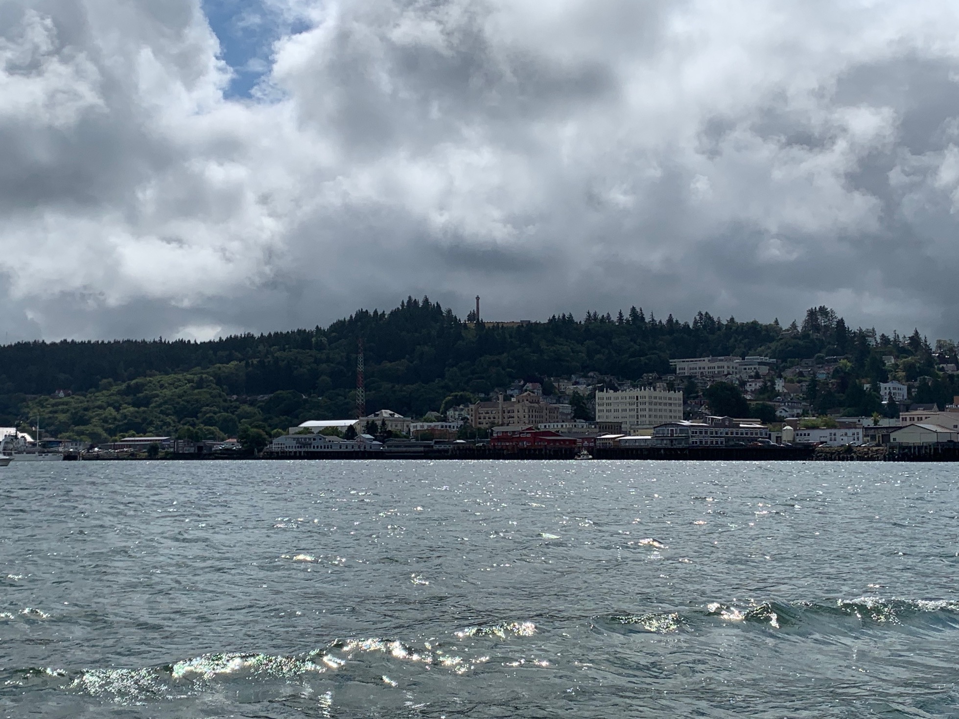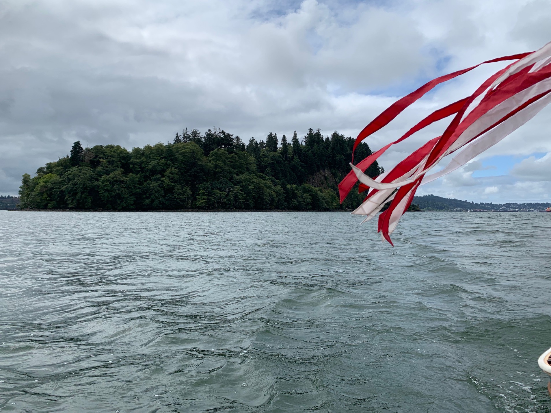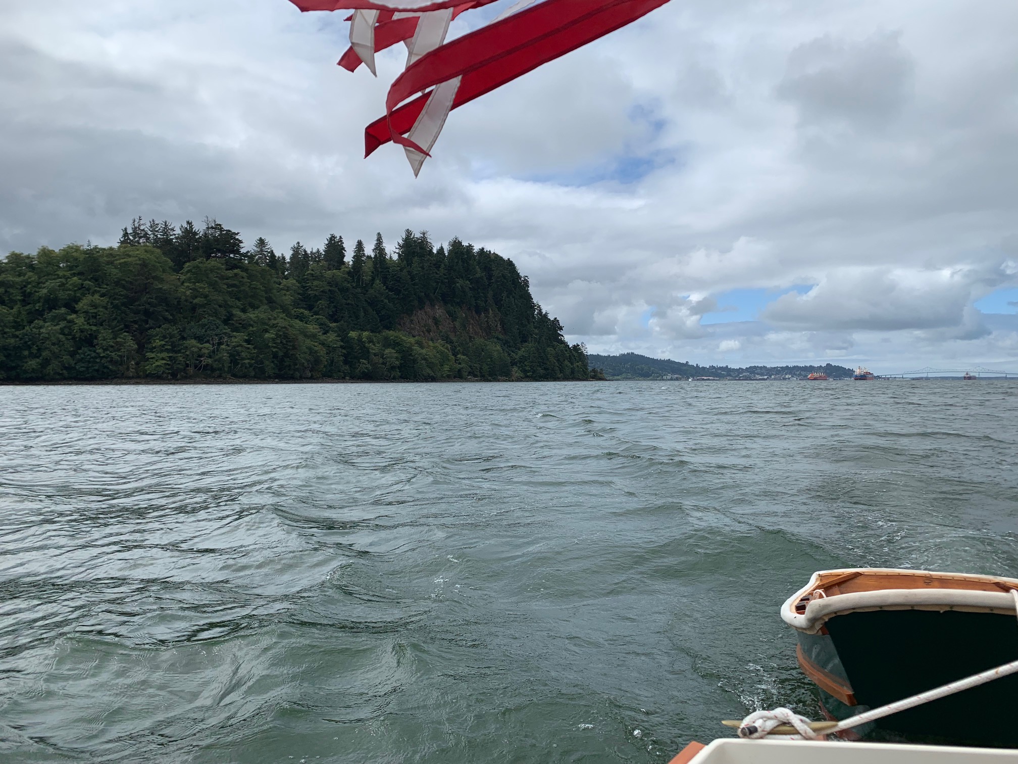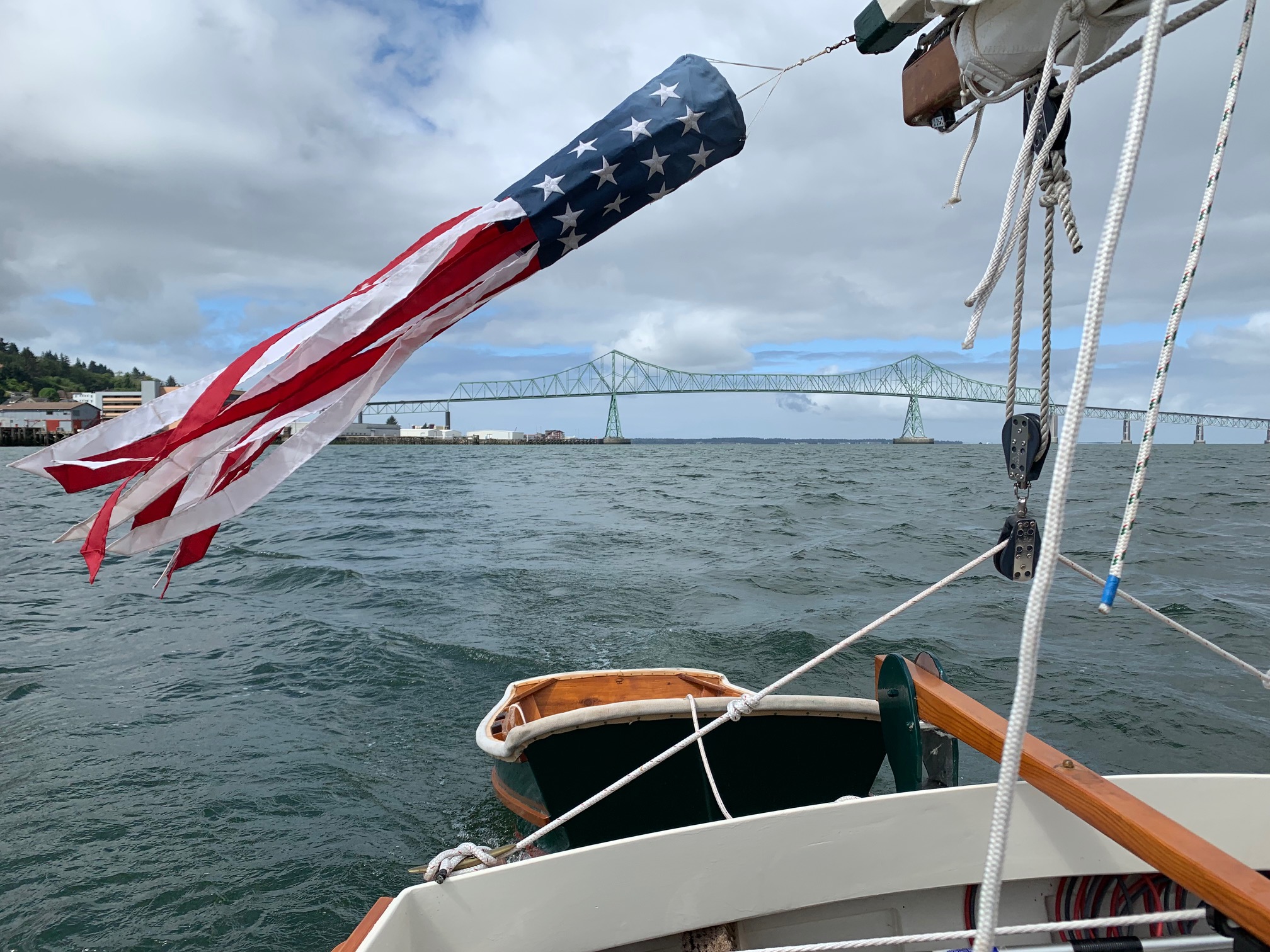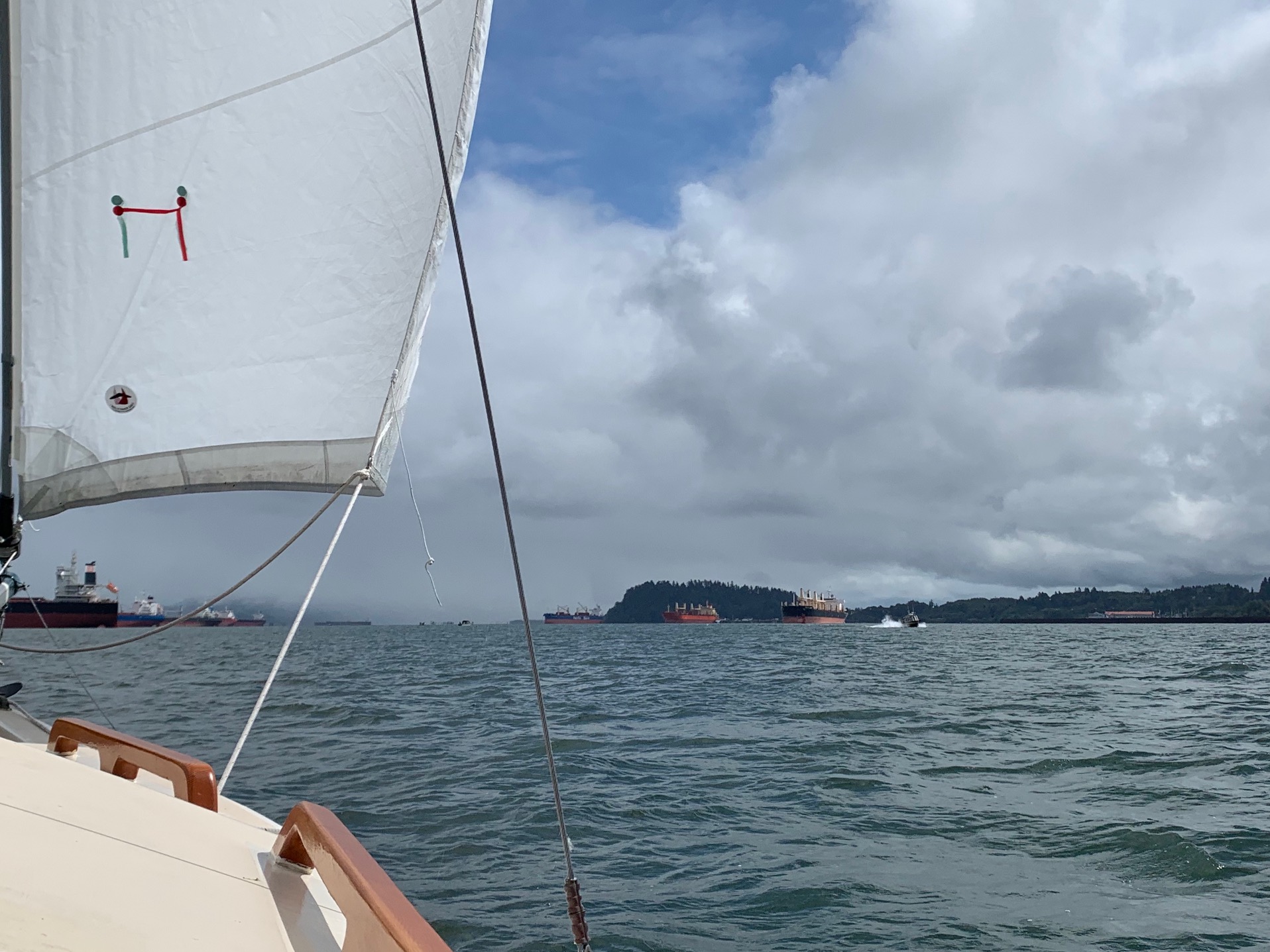 The first night we spent in Steamboat Slough just up river from Skamakowa. It’s a beautiful place like most of the backwater of the lower river. At 6:30 the next morning we caught the out-going tide for Astoria! On the way down, ships (big ships) were making way up river. What is interesting about this river is it is so beautiful, and there are very few people sailing or cruising it. We feel like it is all ours! My mind goes back to Captain Vancouver, Gray, Lewis and Clark and the men that made way across the country that were employed by Jacob Astor. This place is beautiful and having the opportunity to sail it is truly an honor!! One of the biggest blessings is sharing it with my kid and grandkids.
