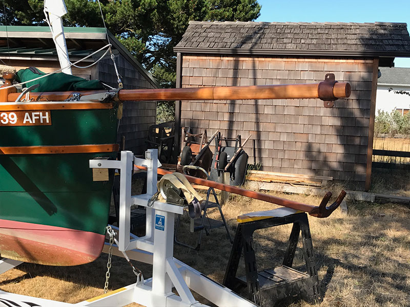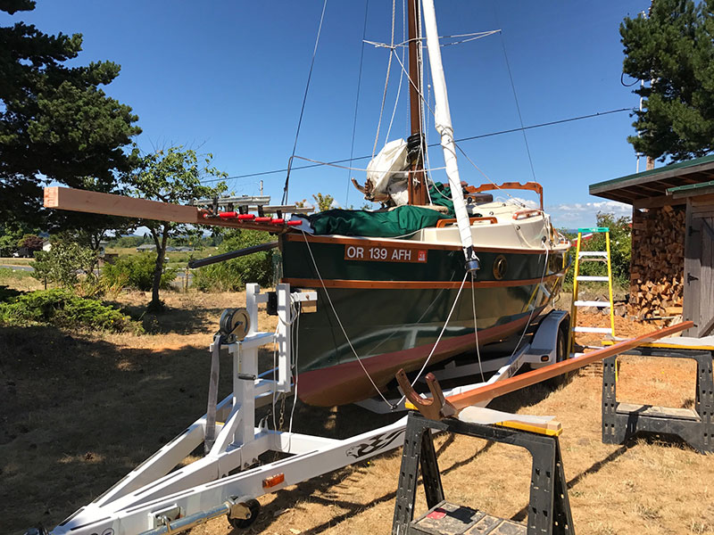 Slough Coot is back in the yard. The previous owner fit the Cape Henry 21 with a bowsprit 32″ long when the plans show 4 feet. He also built the gaff at 9 feet, when the plans show 12′-4″. I have had a new mainsail made and it should be fit to the boat on Aug 16th. The two new headsails I bought are to the plans specs. With now a to spec bowsprit and new main she should sail the way she was designed to!! For the life of me I do not understand when someone builds a new boat or airplane and they DON’T build it to the designed specs, then wonder way it doesn’t fly right!!