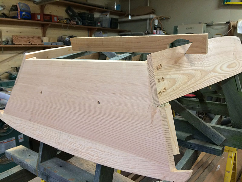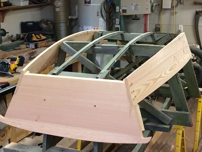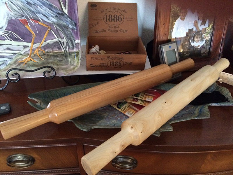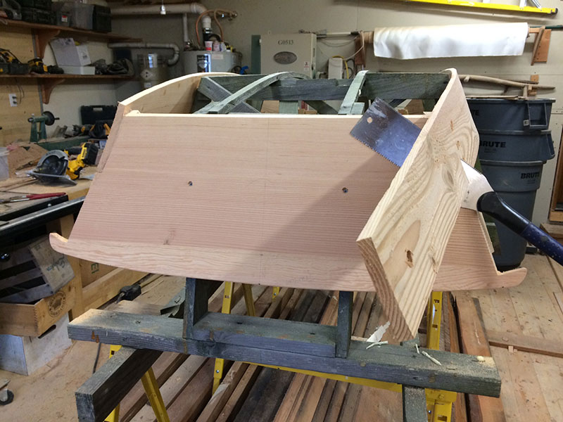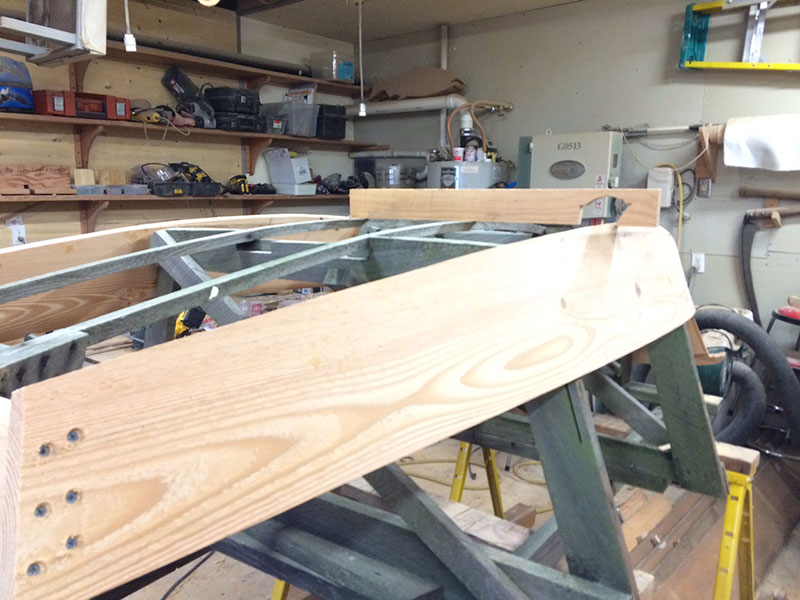 Thursday. Today I spent the morning spinning a couple of rolling pins! One out of Puget Island Ash and the other out of a seasoned branch of vine maple. For two hours this afternoon I fit the chine planks to the transoms. I cut them flush with the transoms by using a boat carpenter’s pull saw. As you can see by the scribe tool, I will mark the chine and plane it accordingly.