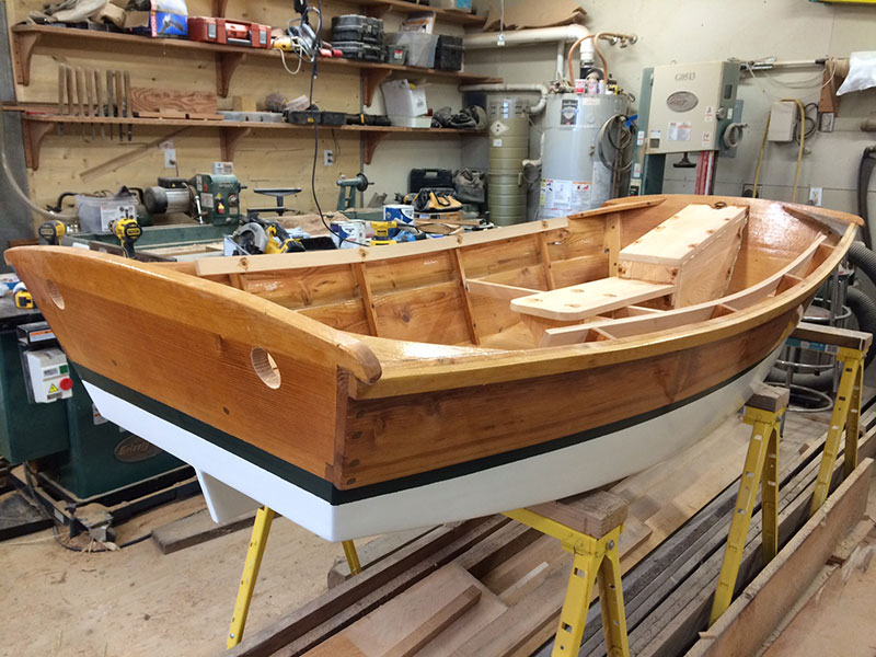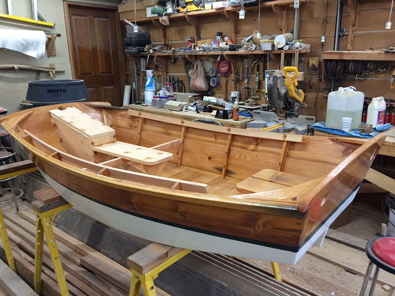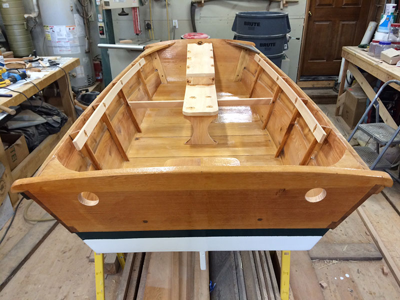 Wednesday. Today, I spent 7 hours pretty much finishing all the carpentry on the boat. The wheel well, forward bench seat along with the thwart that will support the tips of the oars and the inwales were cut and fit. I then mixed epoxy with wood flour and filled the holes. The 2″ holes are drilled thru the aft transom for the oars. Next I sanded it all fair and sealed it with clear epoxy.
