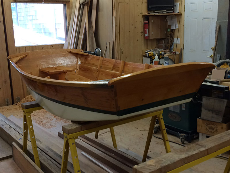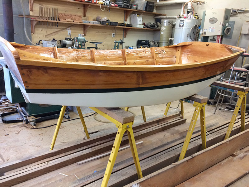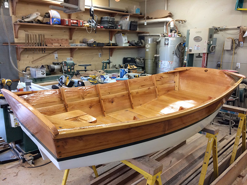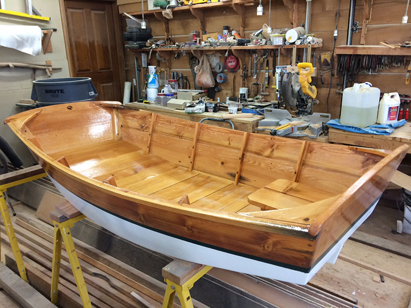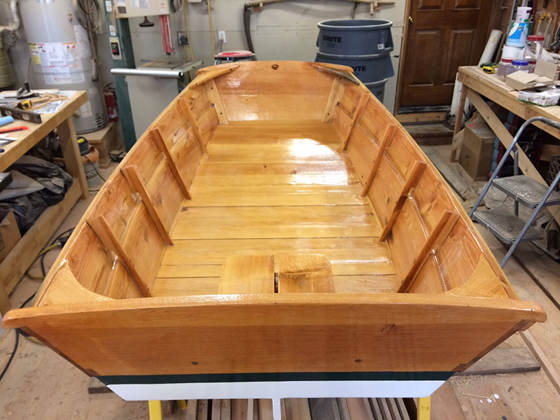 Tuesday. Today I put in 10 hours cutting and fitting the knees, ribs and aft bench seat. Then epoxy mixed with wood flour and filled all holes and voids. After the holes were filled I mixed clear epoxy and sealed the wood. Tomorrow I’ll be working on the forward wheelbarrow wheel well.
