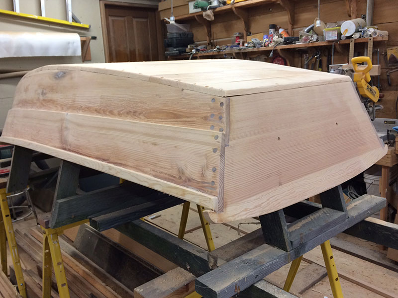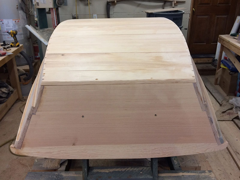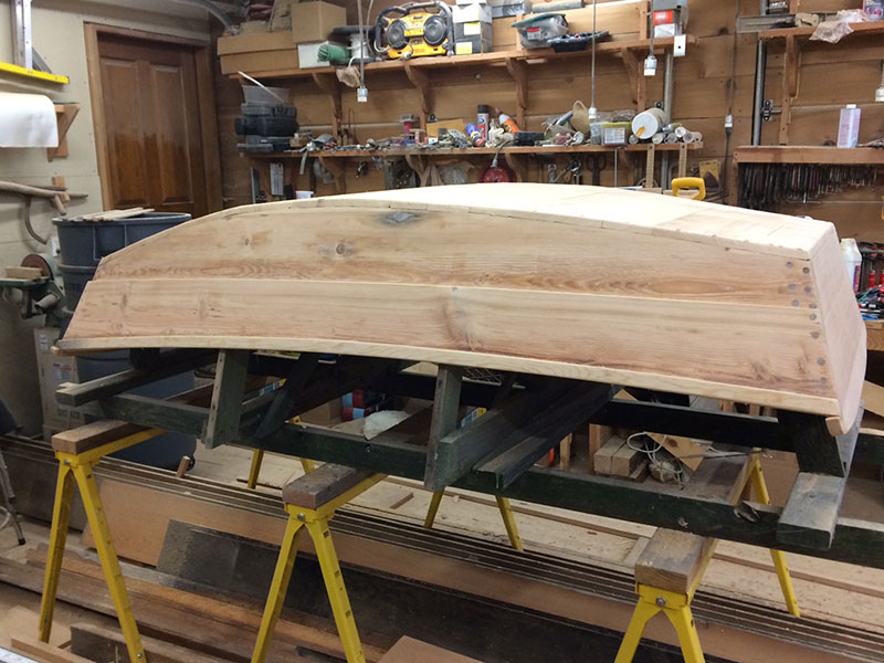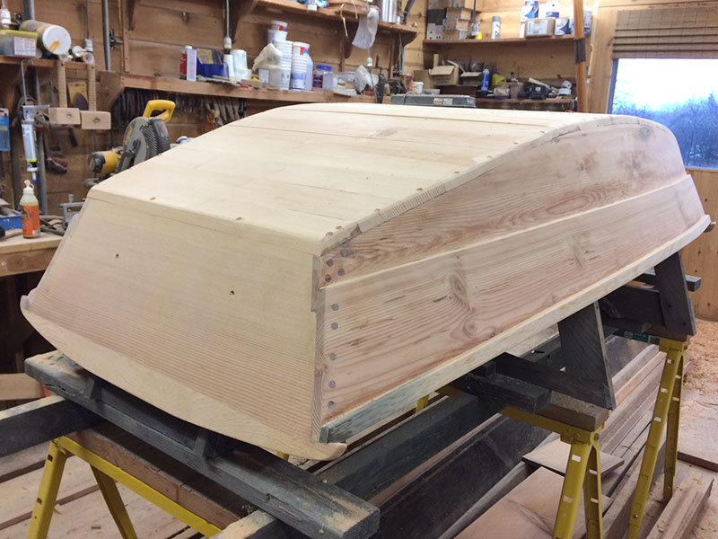 Harry Bryan’s Ladybug Wheelbarrow Boat – Planks Flush With Transom Posted on January 19, 2016 by coffeeadmin Tuesday. Today I put in 5 hours cutting the sheer planks flush with the transom. Then, I cut and fit the 21) 1×4 bottom hull planks. Tomorrow I’ll glue them down and then start the process of fiberglassing the hull up to the top of the chine strake. [Show as slideshow]