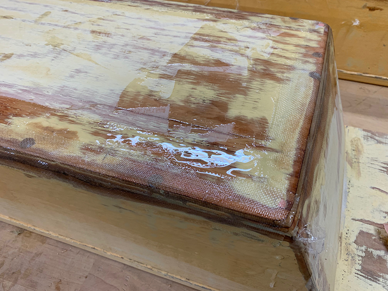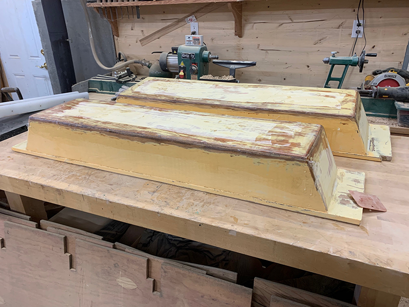 Today I masked off the fore deck and aft bench seats and painted them TotalBoat off-white. Then I banded the center bench seats with fiberglass for strength. Tomorrow I will mask off the fore deck and aft bench seats and paint the center areas with TotalBoat non-skid beige.