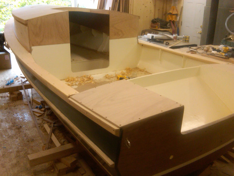After finishing up the hands sawn deck beam for the companionway, all the deck beams were complete. These deck beams make up the ceiling for the cuddy cabin. I then finished building the cabin itself. Next come the building of the companionway hatch and door. Started at 9:45 am and ended at 5:45 pm.