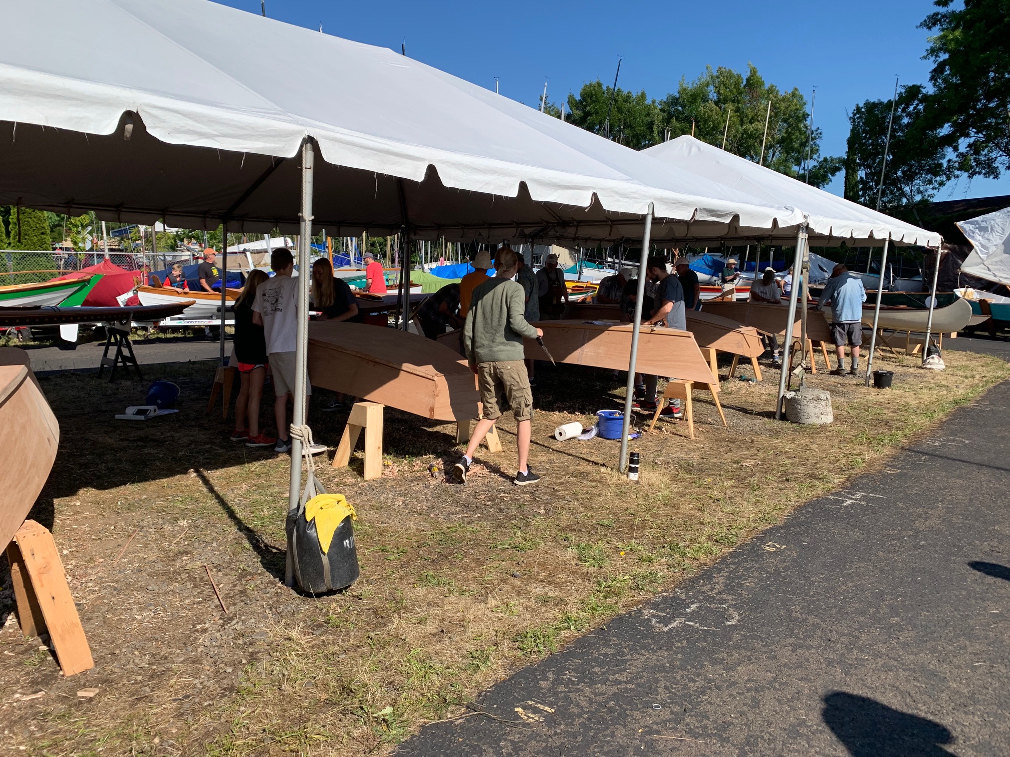 Most boat were on the hard along with a large tent set up with 12 families, 12 mentors and 12 “Salt Bay Skiff” kits ready to assemble. After each family along with their mentor worked all day Saturday and most of the day Sunday, they launched their unpainted boat and took them for a spin.
