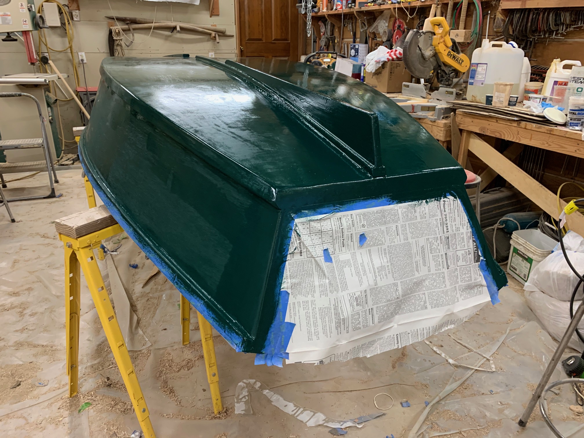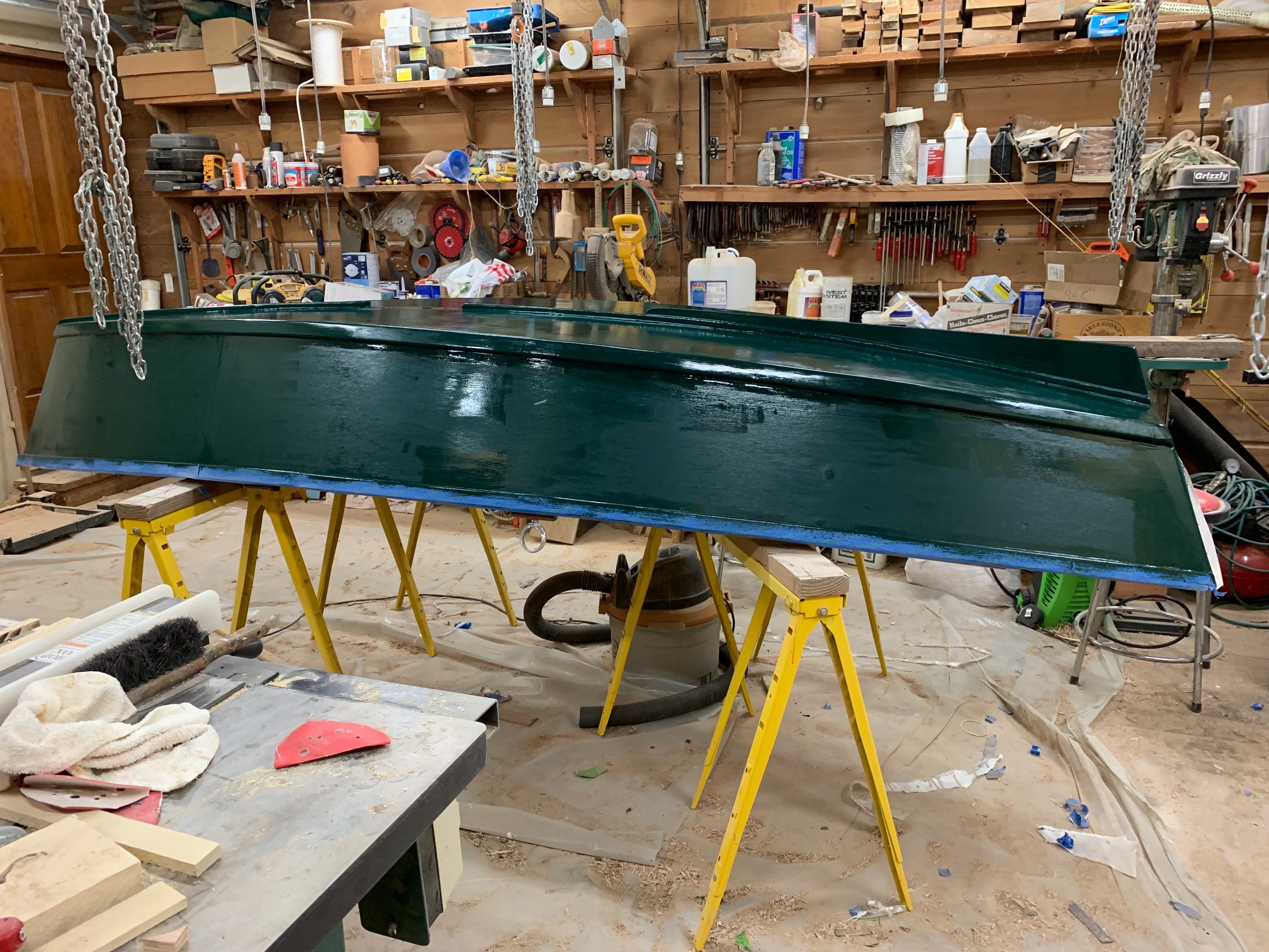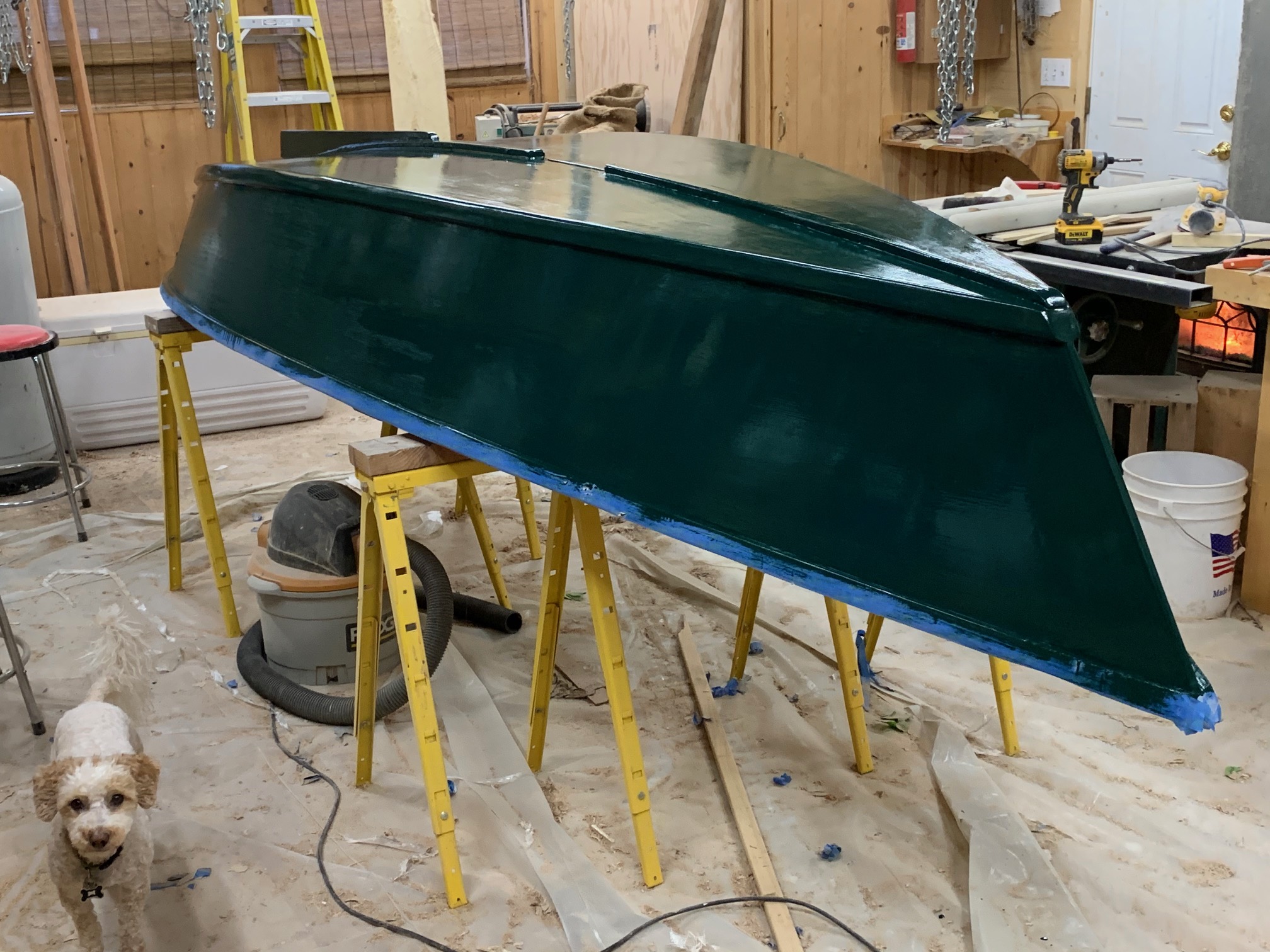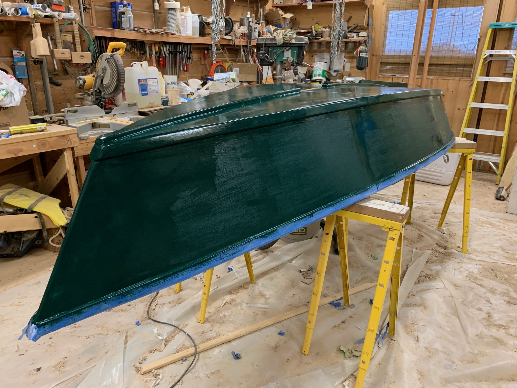 This morning I faired the hull and applied the first coat of EZPoxy Jade Green top coat. At least 2 more coats to go.