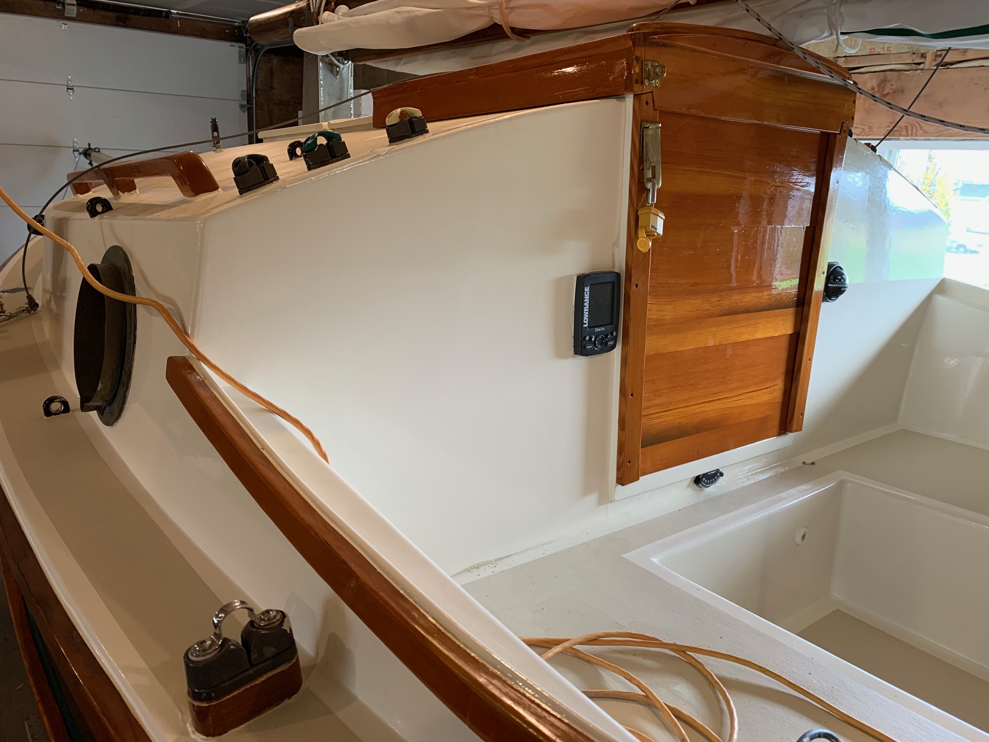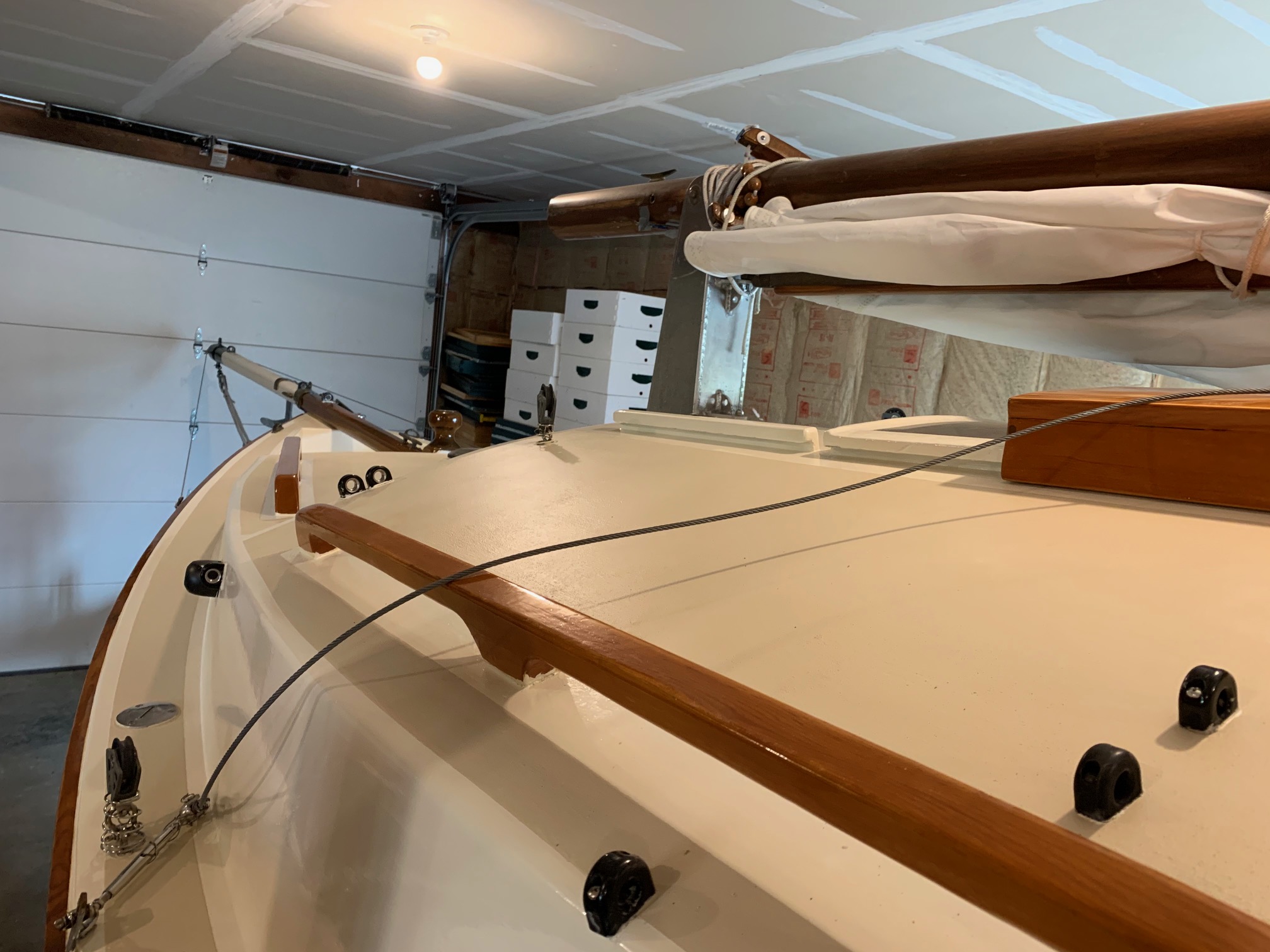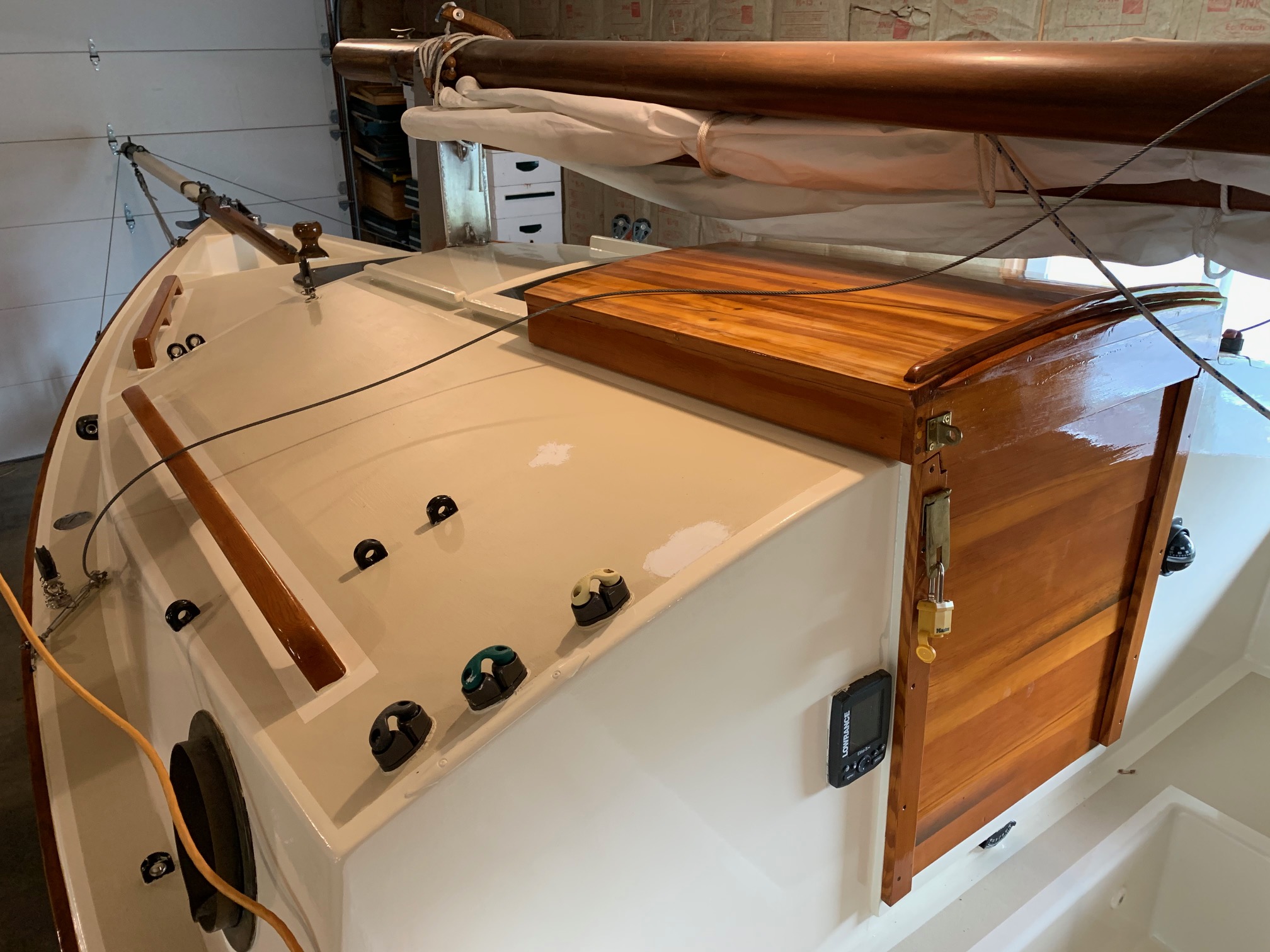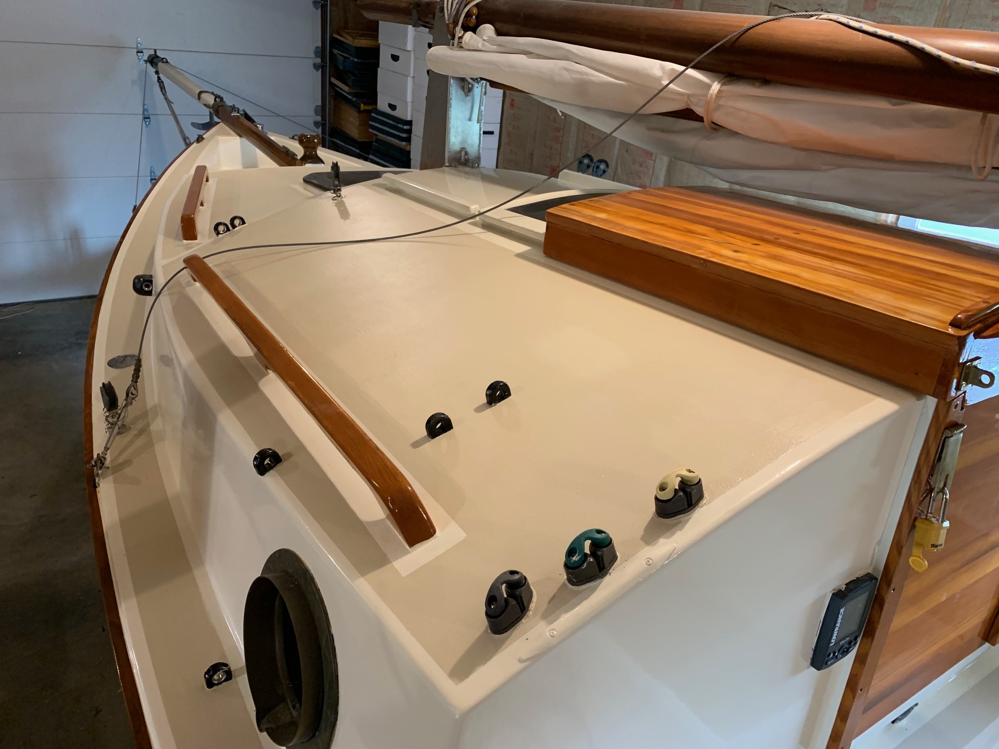 Slough Coot – Finish the Brightwork Posted on November 15, 2019November 18, 2019 by coffeeadmin This last week I varnished all exterior brightwork. I also moved a cam-cleat and fairlead on the port upper deck for the new staysail furler line. [Show as slideshow]