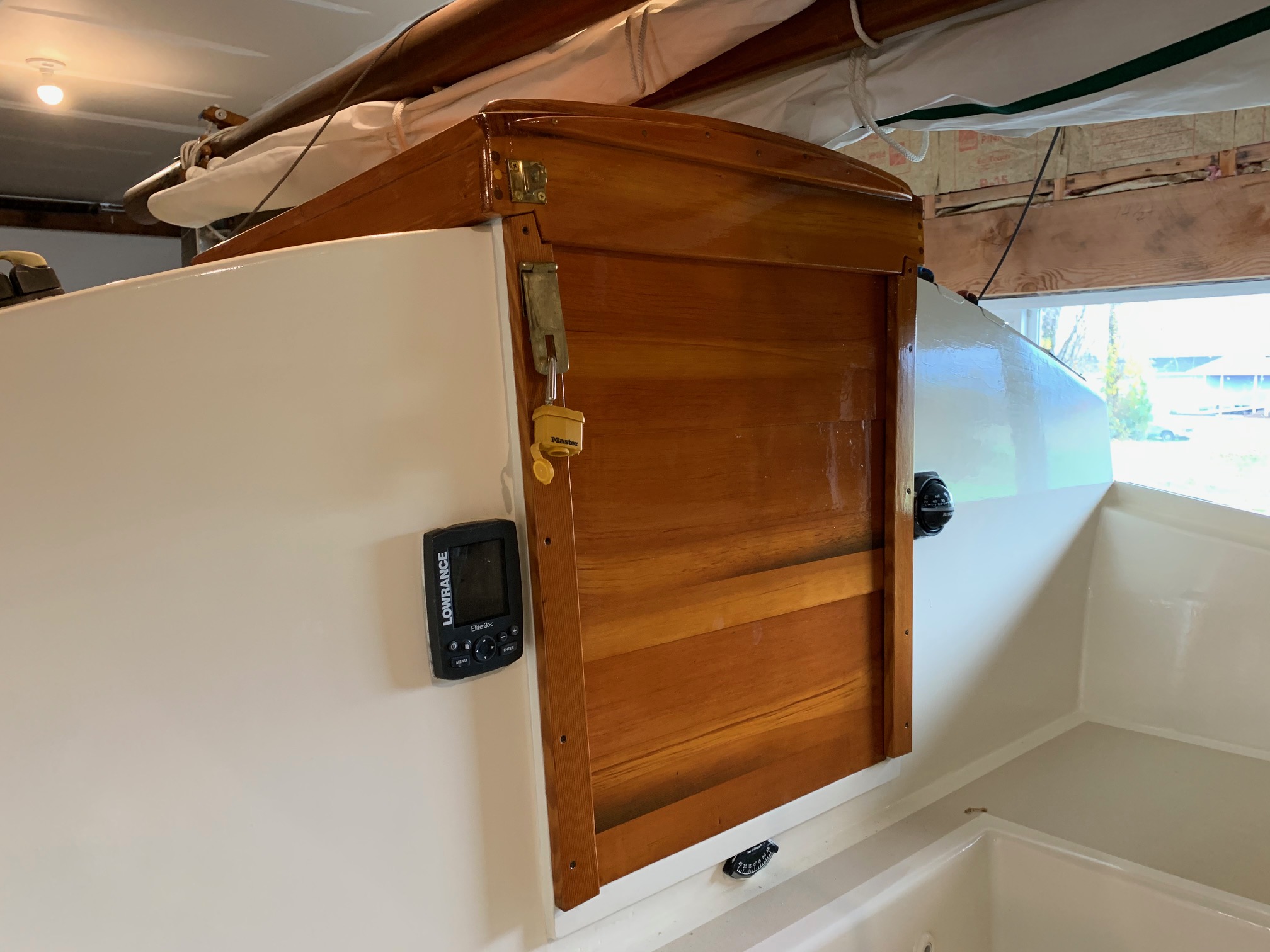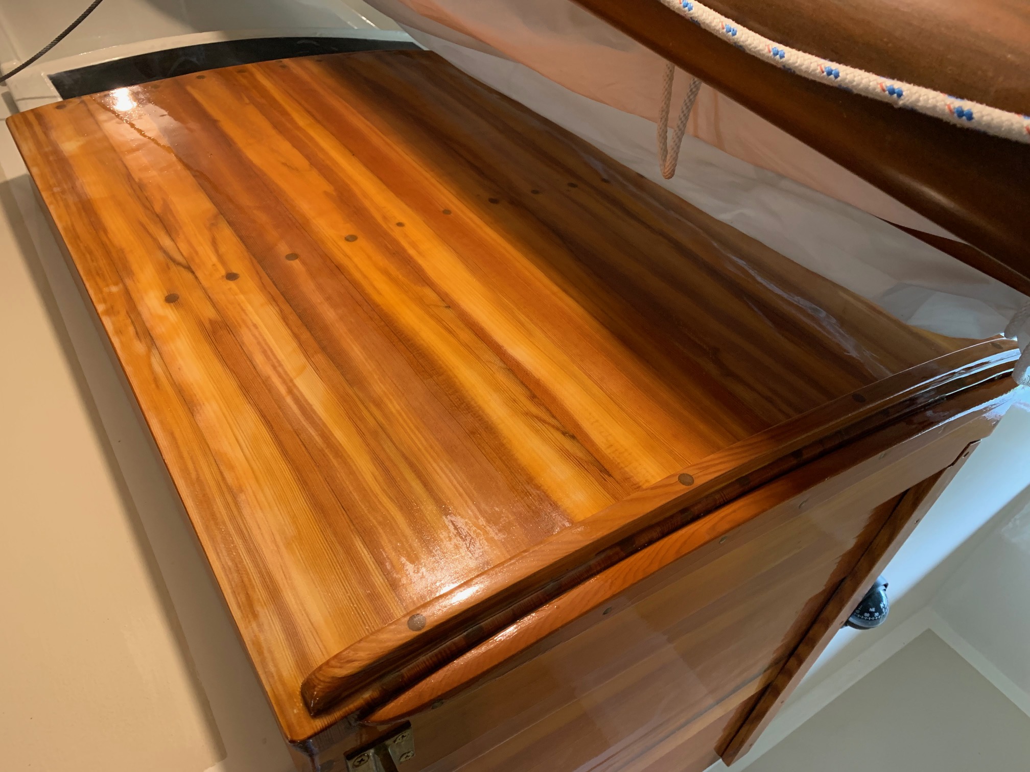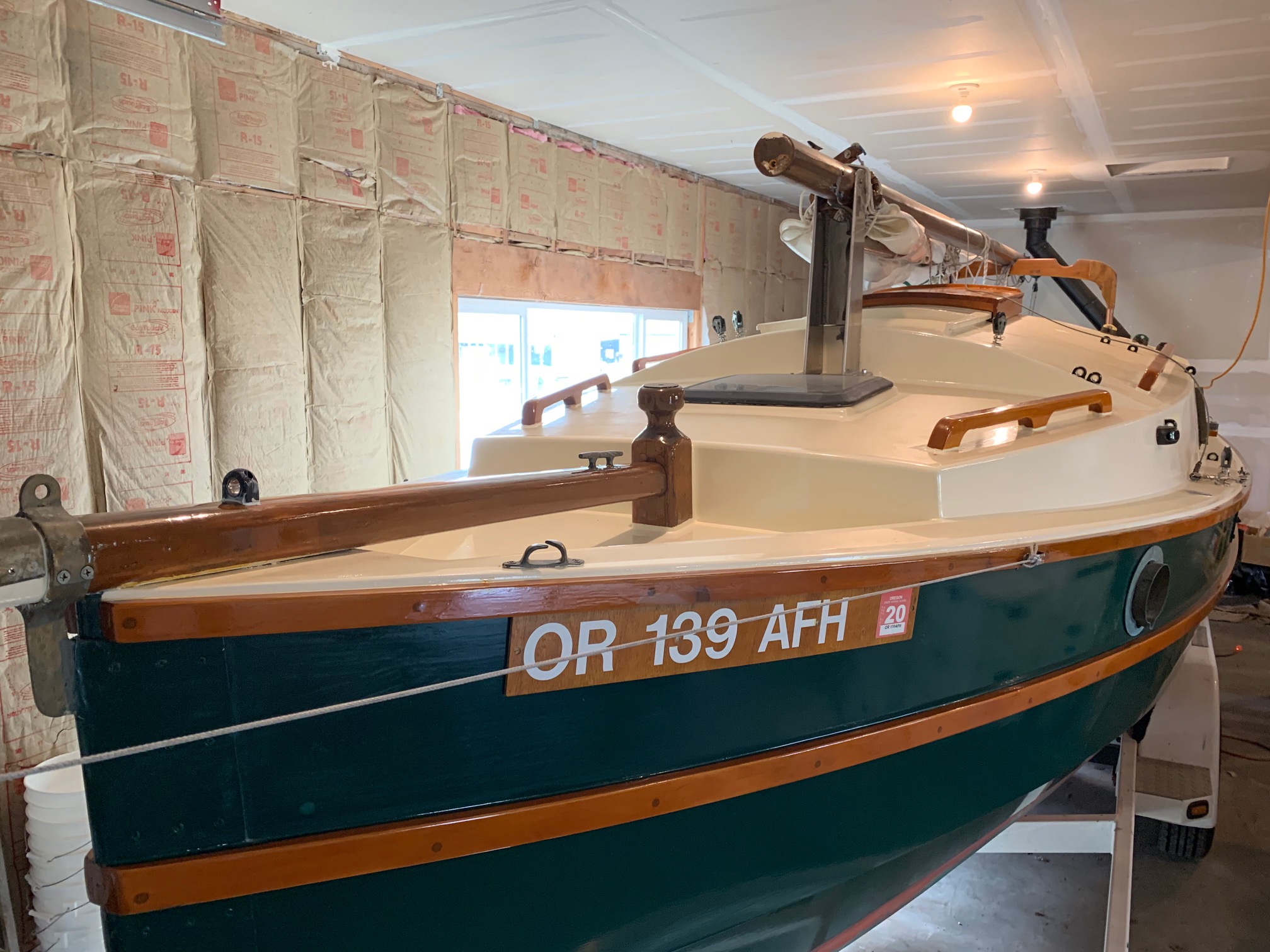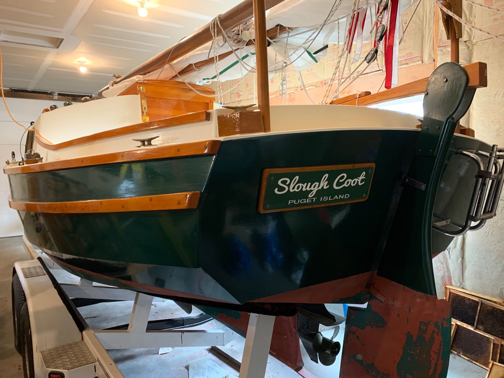 Slough Coot – Finish the Brightwork Posted on November 15, 2019November 18, 2019 by coffeeadmin This last week I varnished all exterior brightwork. I also moved a cam-cleat and fairlead on the port upper deck for the new staysail furler line. [Show as slideshow]